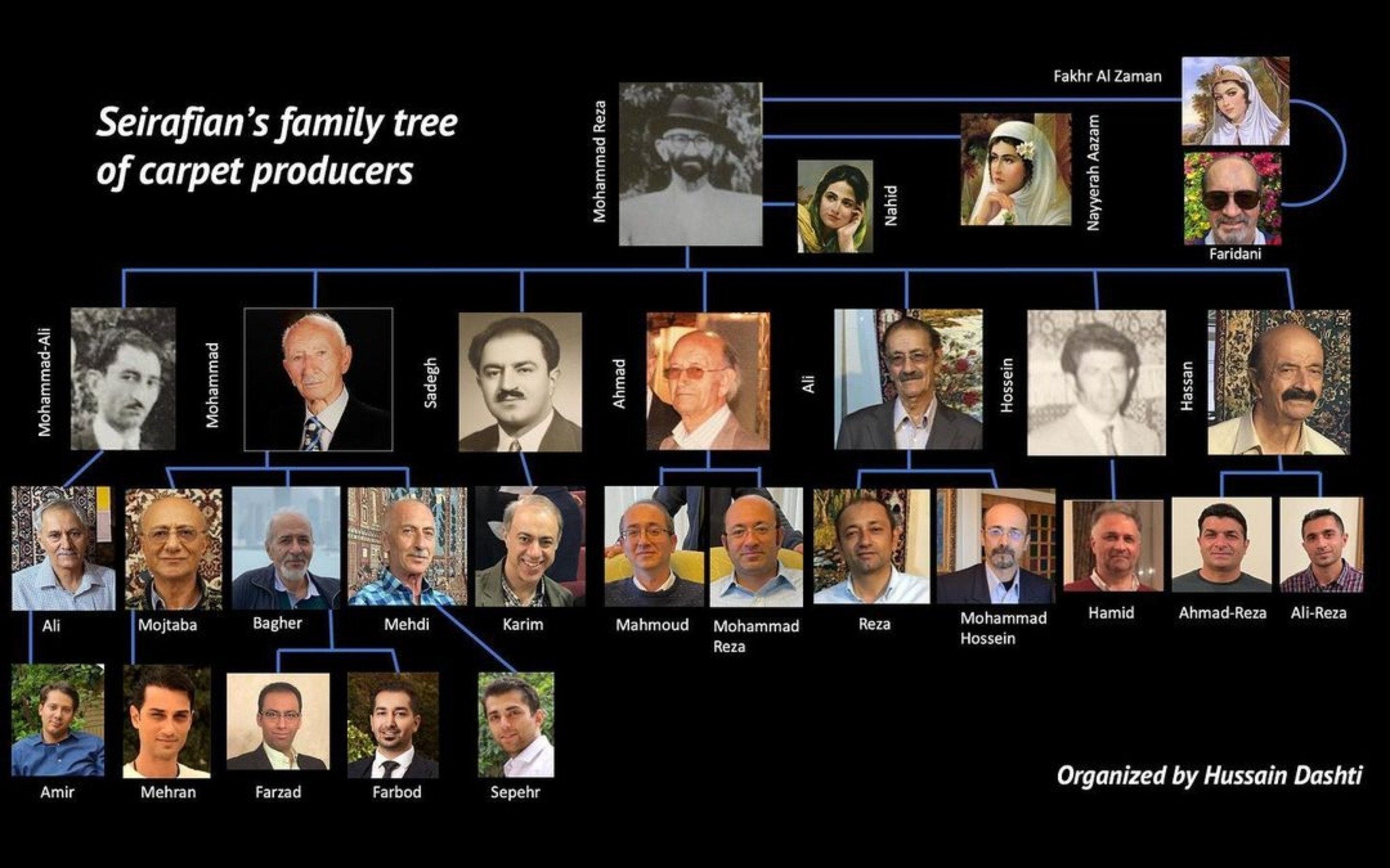 L'impegno della famiglia Seirafian nella fabbricazione di tappeti persiani è continuato attraverso le generazioni successive, ognuna delle quali ha portato la propria influenza artistica e ha mantenuto i rigorosi standard stabiliti da Haj Agha Reza Seirafian. Questo impegno ha portato alla creazione di design unici che fondono elementi tradizionali persiani con adattamenti moderni, consentendo ai tappeti Seirafian di evolversi mantenendo la loro integrità culturale. Nel tempo, la famiglia ha sviluppato uno stile distintivo che spesso include intricati motivi floreali, forme geometriche e medaglioni centrali, tutti con significati simbolici nell'arte persiana.
