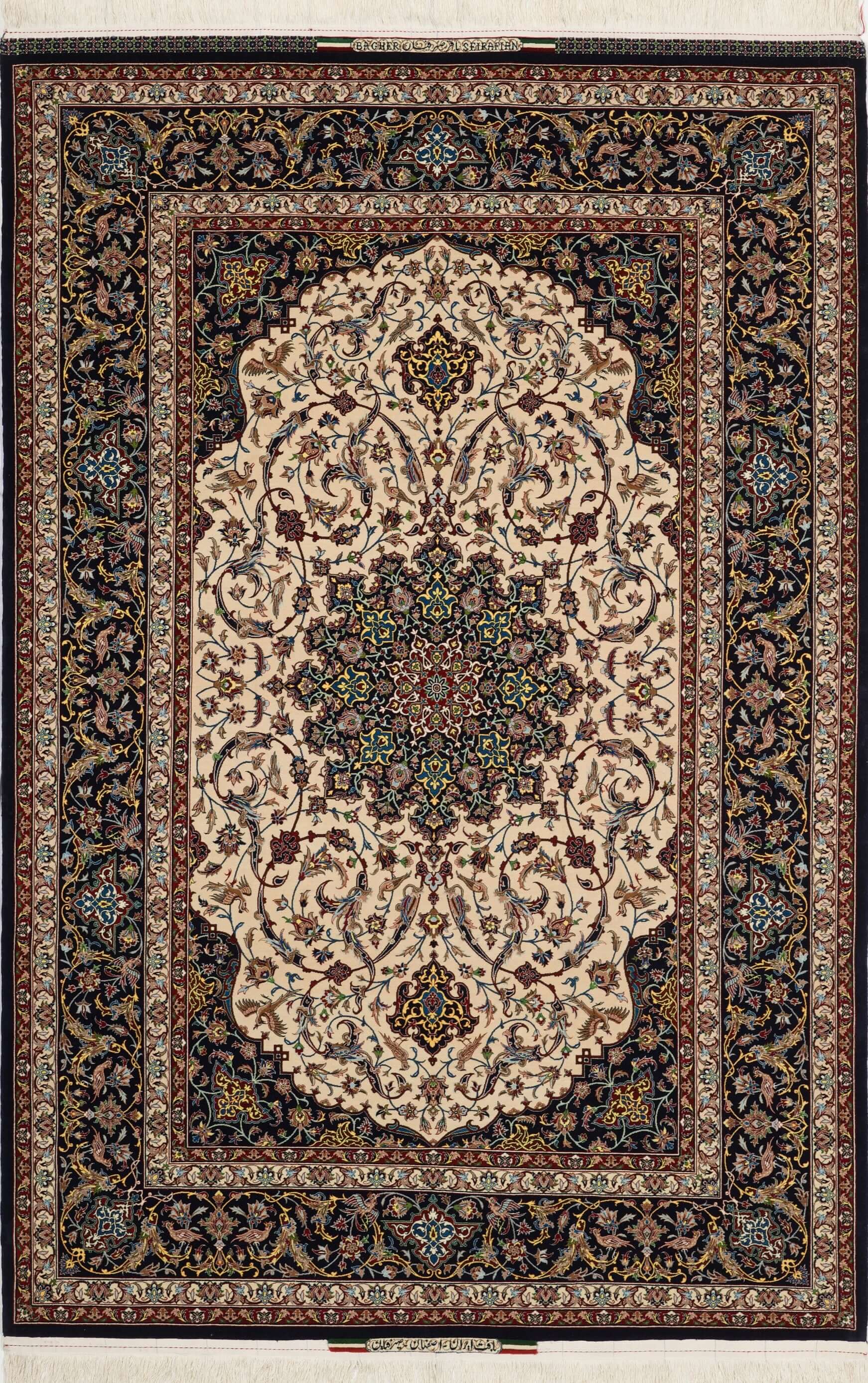 マスター バゲル セイラフィアンが手織りした傑作、この素晴らしいペルシャ絨毯で、室内装飾を高めましょう。最高級のシルクとウールで作られたこのイスファハン絨毯は、優雅さと耐久性の調和のとれた組み合わせを誇っています。この絨毯の複雑なデザインは、クリーム色の背景に魅惑的なメダリオン パターンを特徴とし、繊細な花と鳥のモチーフで飾られた濃い青の縁取りで縁取られています。天然染料が赤、金、緑の鮮やかな色合いを引き出し、美しさと洗練さを永続的に保っています。1 平方メートルあたり 1,210,000 ノットのノット密度を持つこの豪華な絨毯は、精密さと優れた職人技の典型です。リビングルーム、ダイニング スペース、または印象的なセンターピースとして最適で、ペルシャの伝統の真髄を体現しています。